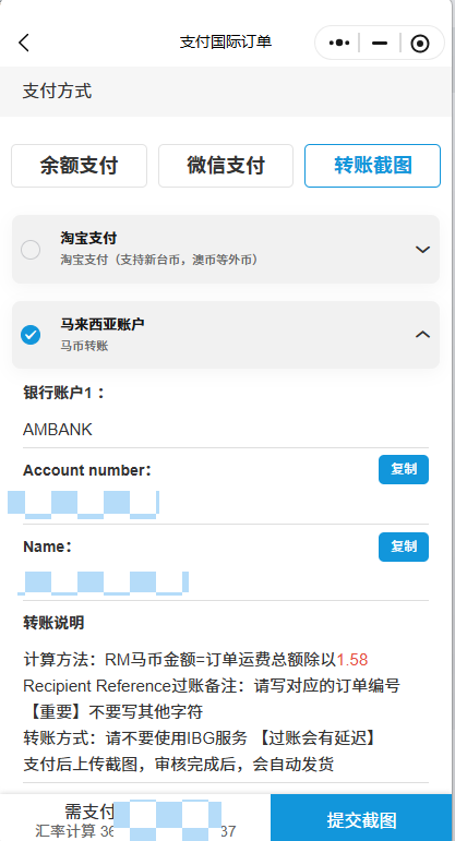 如下图所示,提交订单以后选择支付方式转账截图-马来西亚账户;