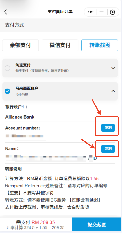 复制马来西亚账户信息,转账入指定的Alliance bank 银行账户完成付款,支付成功后上传支付凭证截图,等待审核通过后自动发货即可。