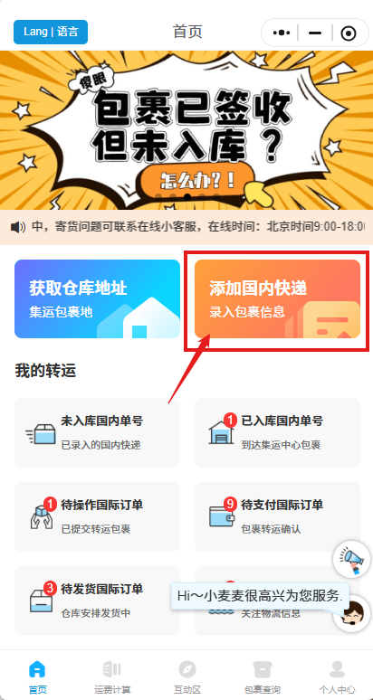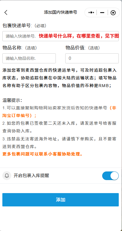 点击添加国内快递,预报您的包裹信息