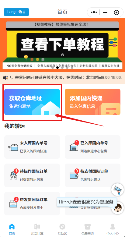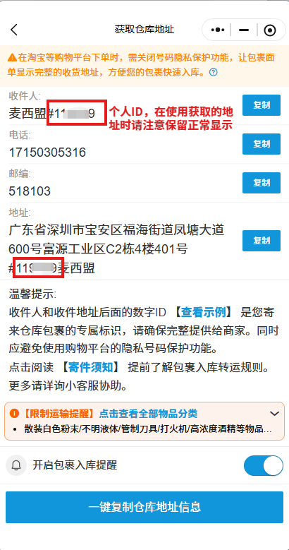 获取仓库地址,请注意需保留#号后的数字,那是您的包裹专属识别ID,便于包裹入仓时能更快且准确为您入库。
