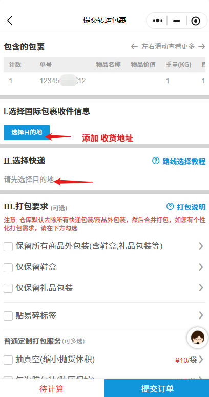 在已入库包裹列表,选择需要转运的物品,然后提交打包;这时可以添加您的海外收货地址,根据您的物品选择合适的快递寄送方式。