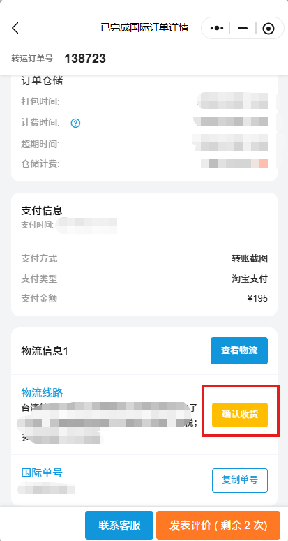 如图所示,点击即可确认收货,并向我们提出客观转运体验评价。