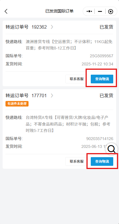 转运订单确认支付成功后,您可在【已发货国际订单】中查看已发货包裹的物流信息,我们已为您实时同步官方物流信息。
