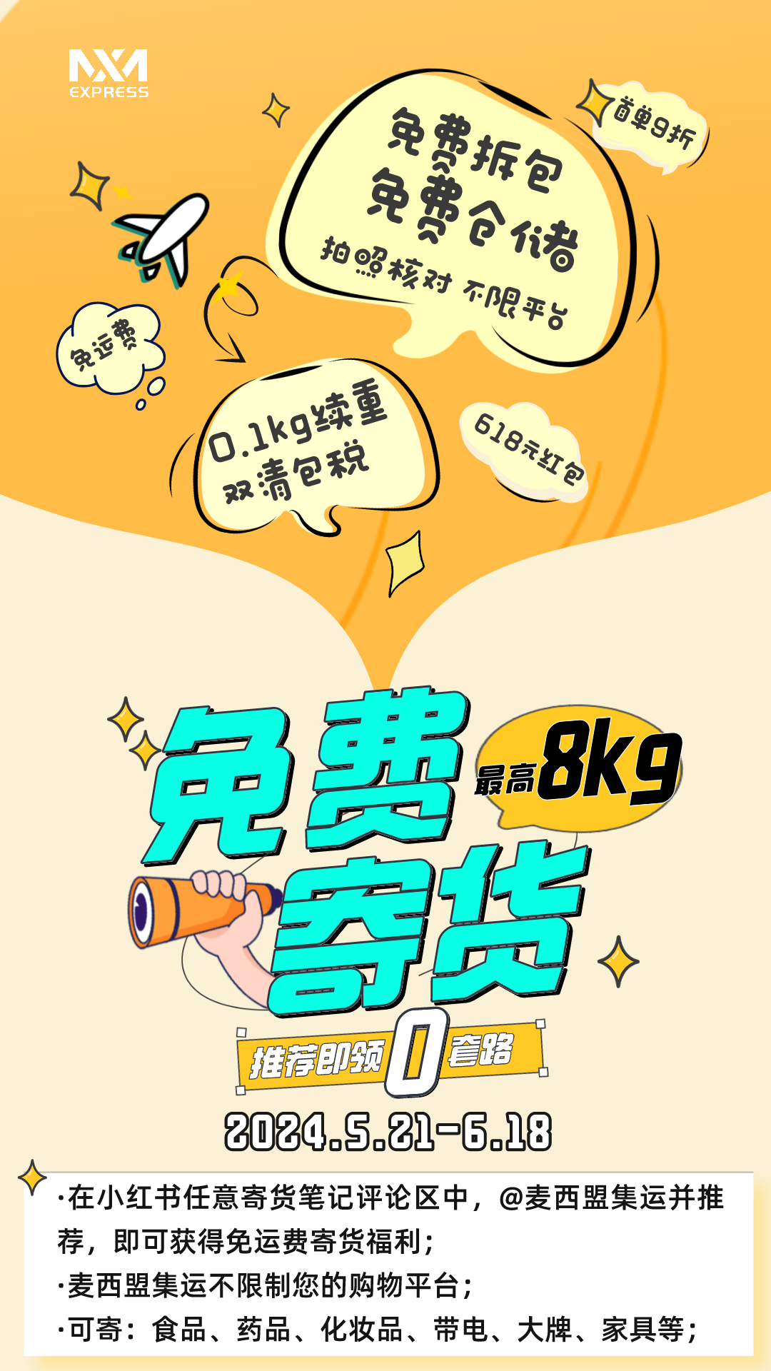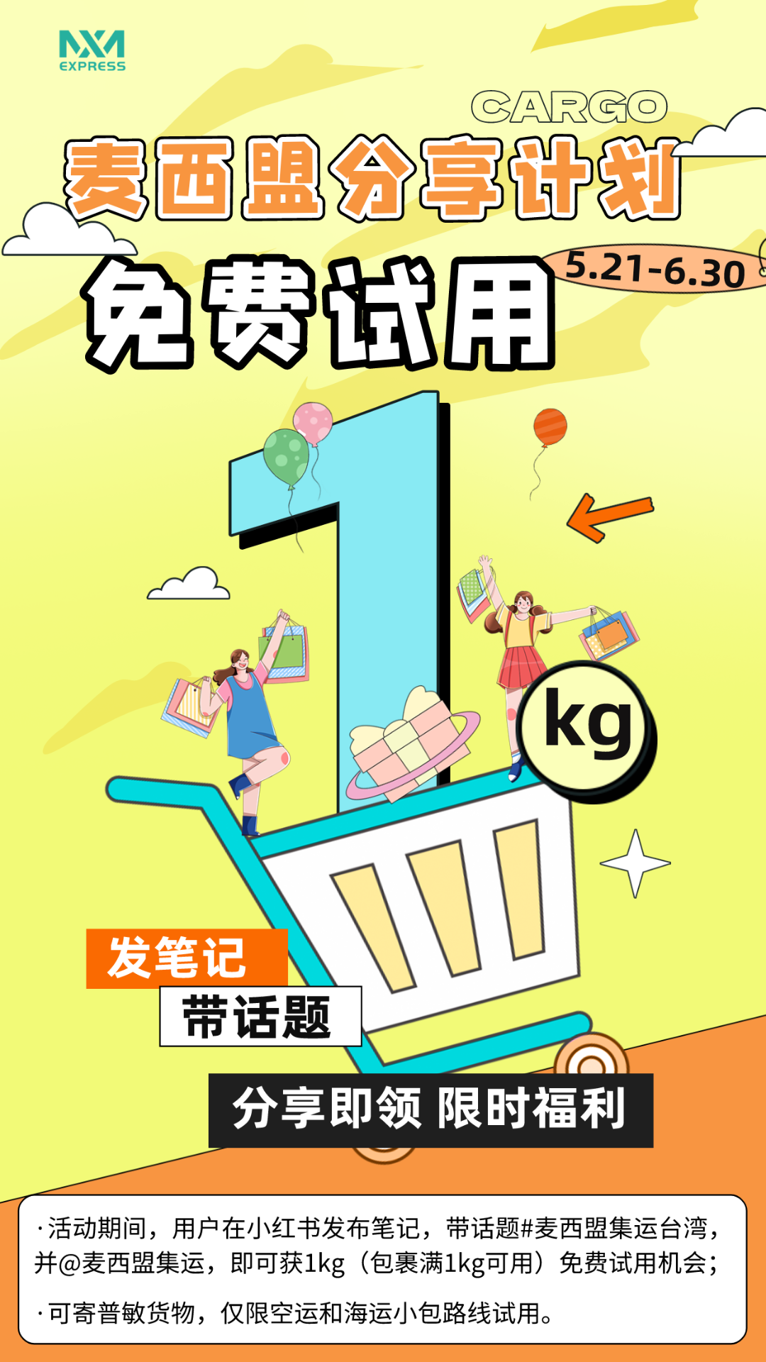 在小红书发布笔记,带话题#麦西盟集运台湾,并@麦西盟集运,可领1kg(包裹满1kg可用)免费试用机会。