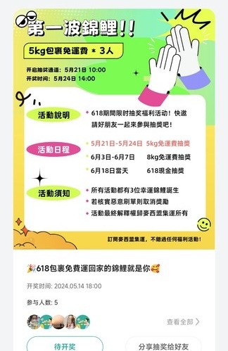 活动期间,用户进入麦西盟集运小红书店铺小程序,点击首页浮标【锦鲤活动】,即可参与618锦鲤抽奖活动,赢取丰厚奖品。