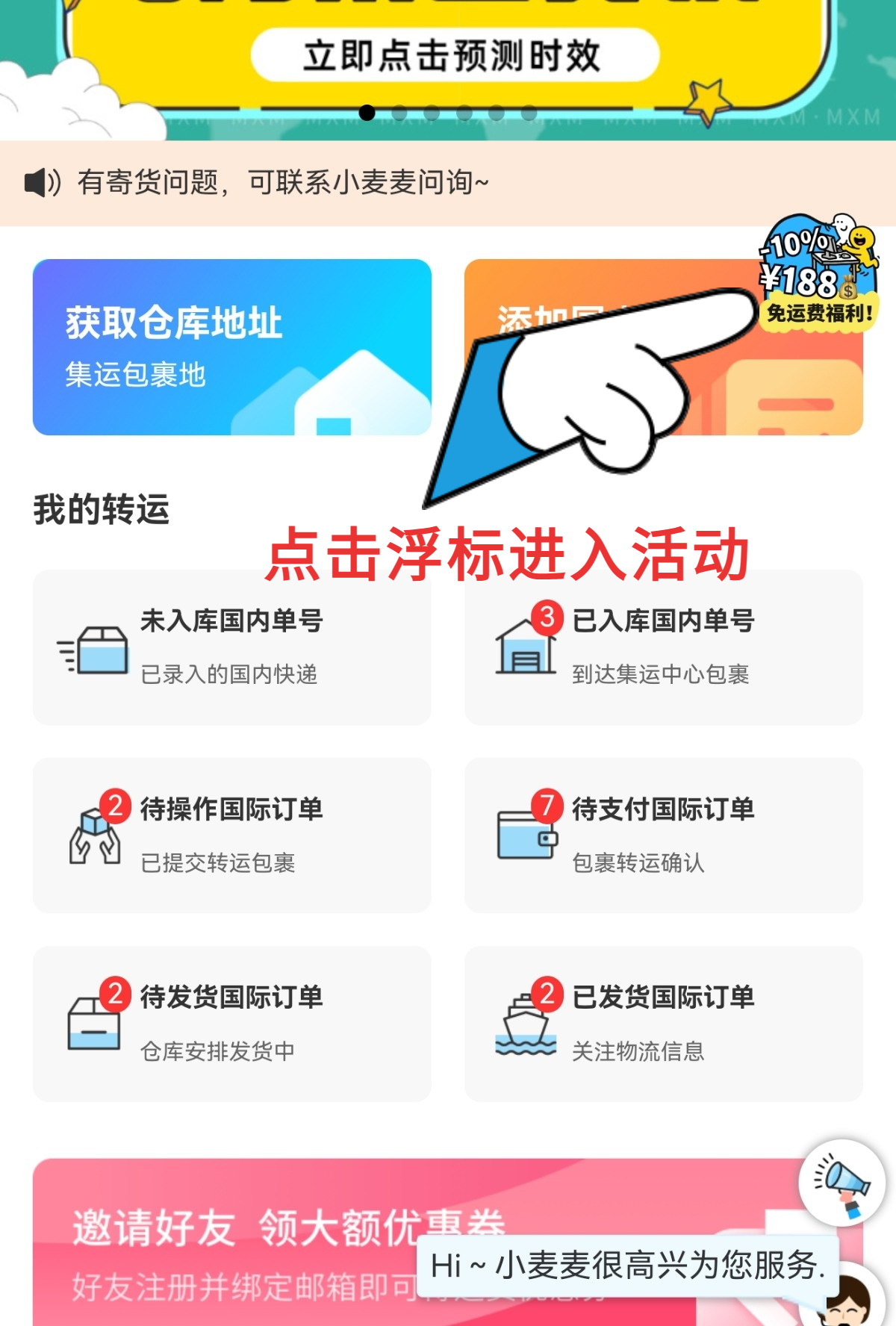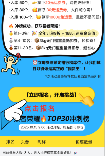 在主页点击浮标【免运费福利】,进入活动界面,点击【立即报名,开启挑战】即可参与活动。报名后,入库包裹将被系统自动计数。
