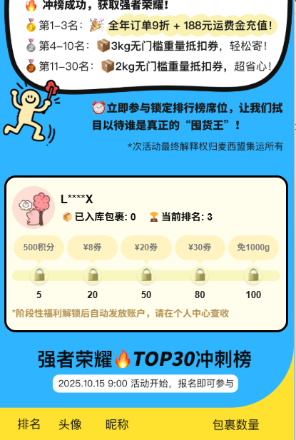 活动期间,入库包裹通过计数排名,闯入强者前TOP30名榜单,即可获得相应额外福利(活动截止后3个工作日内自动发放到账户)。