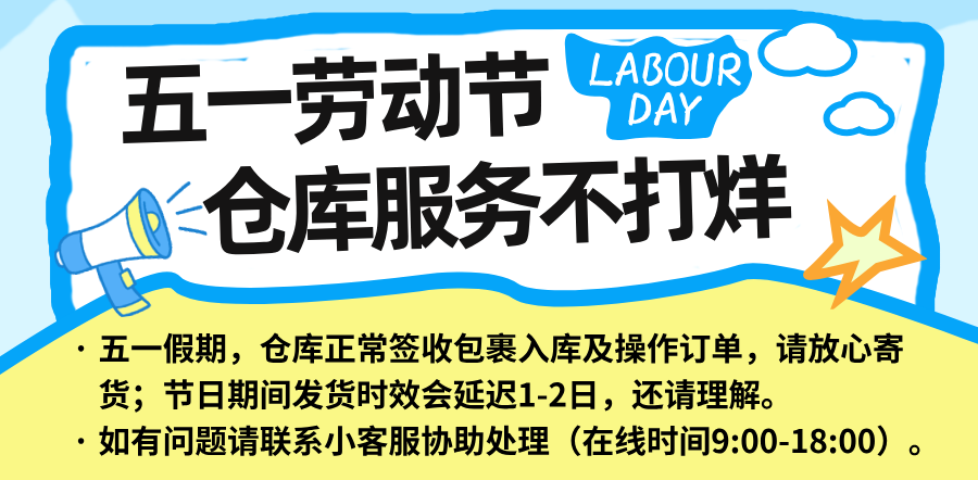 受五一假日影响,5月1日~5月3日期间订单发货时效可能会延迟1~2天,建议大家提前安排节日期间的寄货计划~